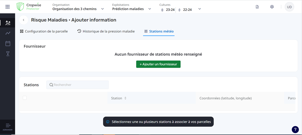 Vous pouvez à tout moment consulter et gérer les stations météo et leurs associations à des parcelles.