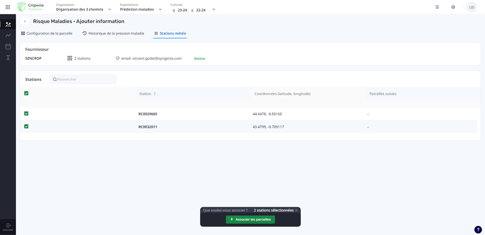 Cochez maintenant les stations météo à connecter à vos parcelles puis cliquez sur le bouton vert « associer les parcelles ».