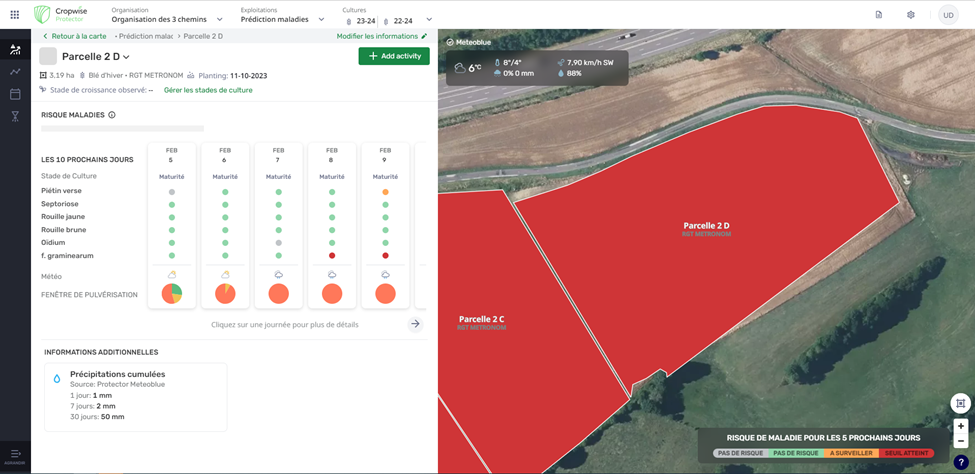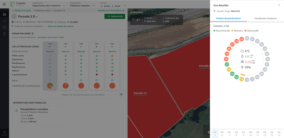 En complément de la prédiction des maladies, nous utilisons également les données météo pour présenter une fenêtre de pulvérisation, pour que vous puissiez prendre la meilleure décision sur le bon positionnement du traitement fongicide selon les données météo.