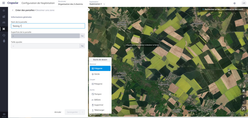 2. Dessin à la main : pour cela, choisissez un nom pour votre parcelle, créez la parcelle en cliquant sur « Polygone » puis sur chaque coin de la parcelle pour être au plus proche de la forme réelle de la parcelle sur la carte. Une fois que vous avez dessiné votre parcelle, cliquez sur enregistrer.