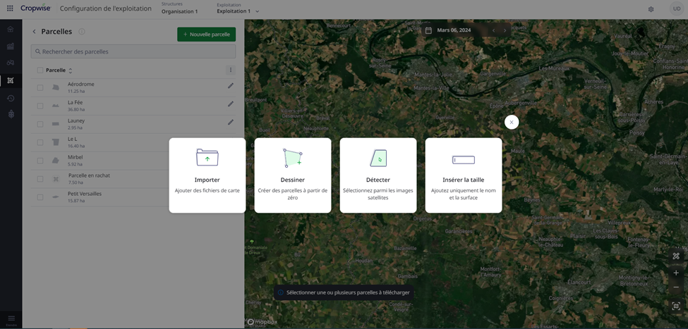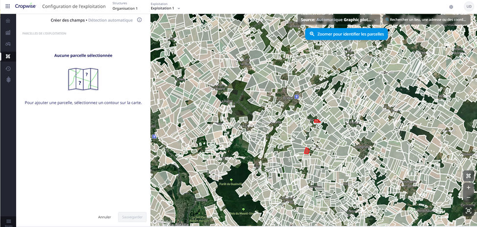 3. Détecter la parcelle automatiquement : cliquez sur le bouton pour identifier automatiquement les limites des parcelles sur la carte. Ensuite, sélectionnez votre parcelle, donnez-lui un nom et cliquez sur "créer des parcelles" pour l’enregistrer.
