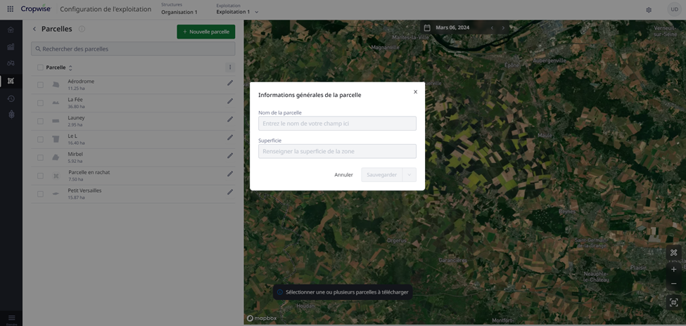 4. Insérer le nom et la surface : saisissez simplement le nom que vous souhaitez donner à votre parcelle et la surface, puis cliquez sur enregistrer.