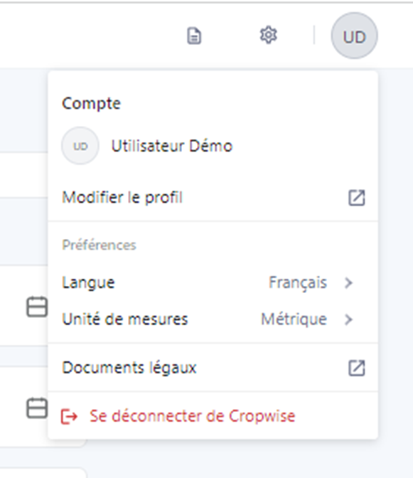 - Dans la liste du Menu utilisateur, veuillez cliquer sur « Se déconnecter de Cropwise ».